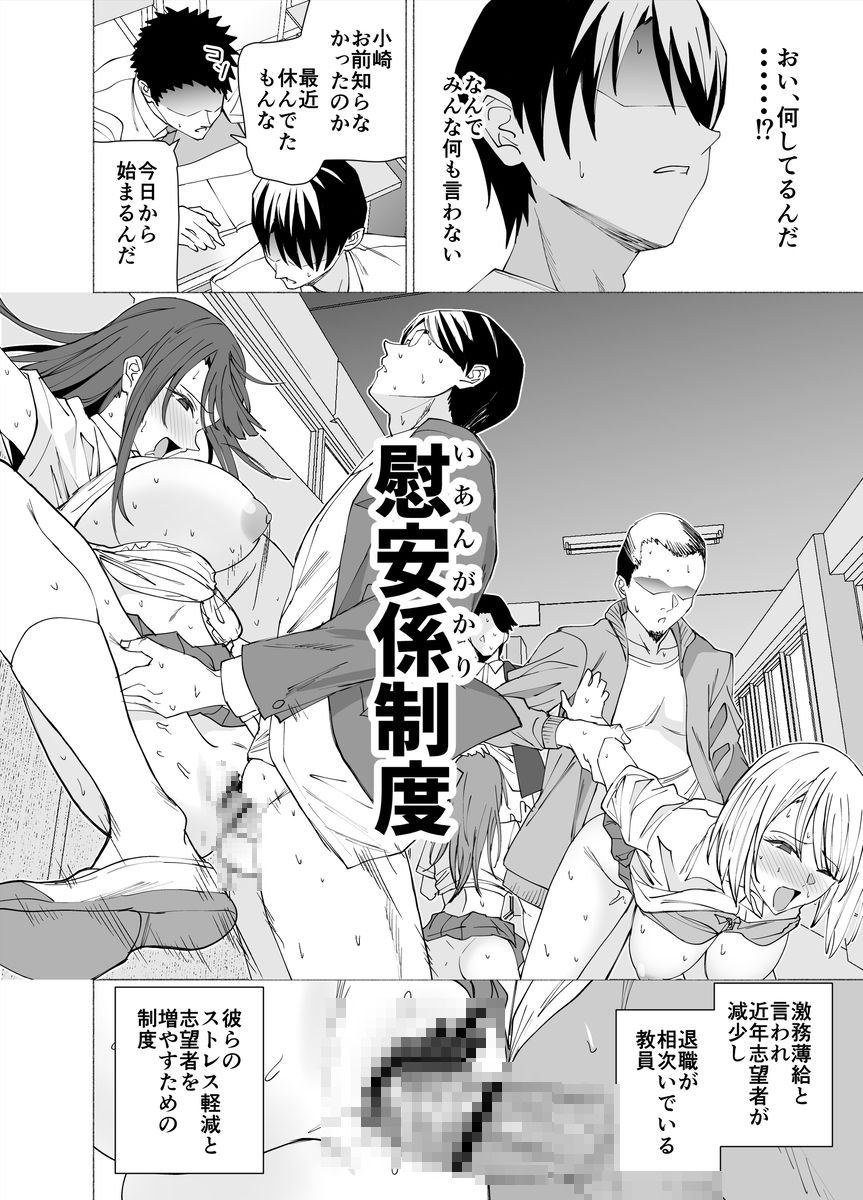 【エロ漫画】激務薄給な教員の為に学校に慰安係制度が導入されたんだけど、彼氏とラブラブな巨乳JKが係りに選ばれてキモい中年教師におっぱい揉まれたりベロチューされて生ハメ中出しされちゃう・・・